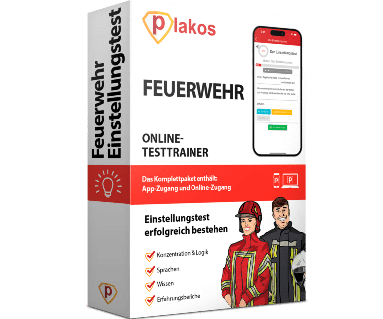 Möchtest du dich bestmöglich auf den Berufsfeuerwehr Einstellungstest vorbereiten? Dann schau dir unseren Online-Testtrainer an! Neben Prüfungssimulationen findest du dort interaktive Übungsaufgaben und umfangreiches Fachwissen. Unsere Inhalte stehen dir auch als App zur Verfügung, damit du flexibel und ortsunabhängig lernen kannst. Sichere dir jetzt deinen Zugang zur Plakos Akademie und erhöhe deine Erfolgschancen!