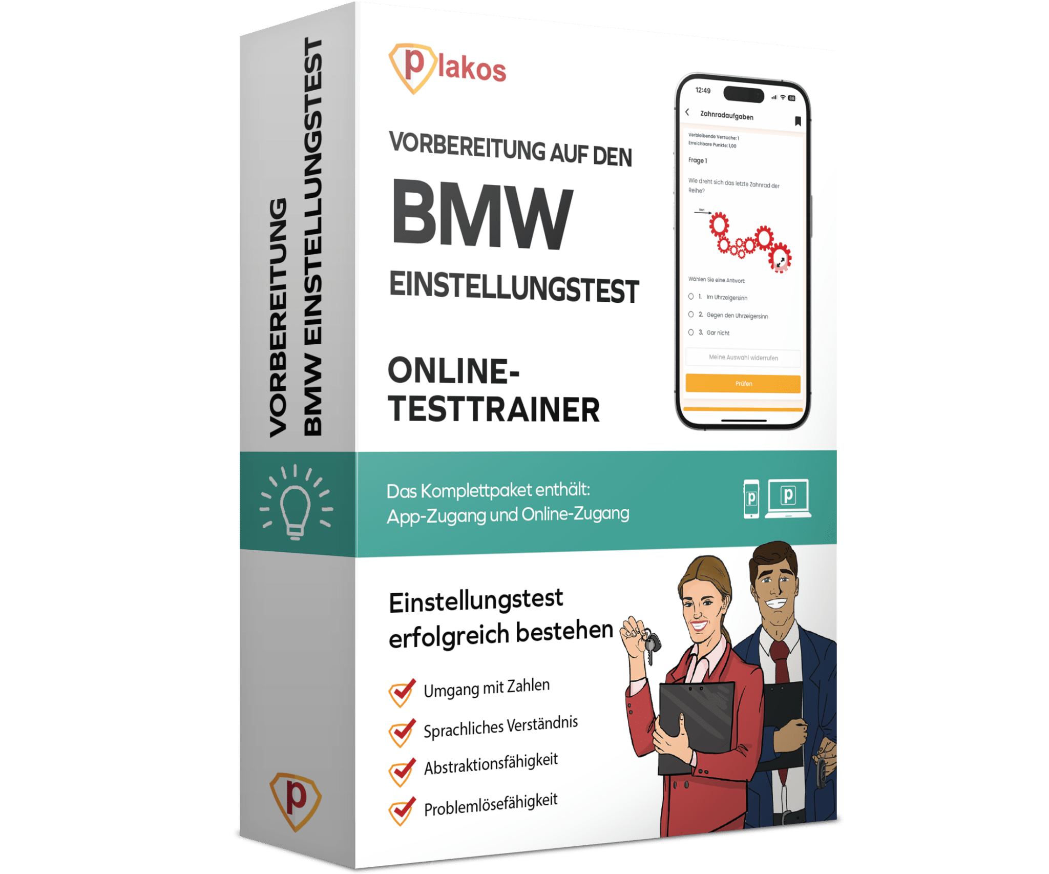 Für eine umfangreiche Vorbereitung auf den BMW Einstellungstest empfehlen wir Dir unseren BMW Einstellungstest Online-Testtrainer. Damit schlägst Du gleich zwei Fliegen mit einer Klappe und bist auch auf den zweiten Einstellungstest bei BMW bestens vorbereitet.