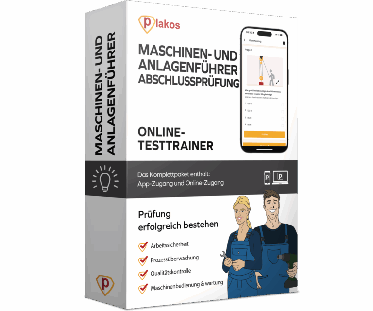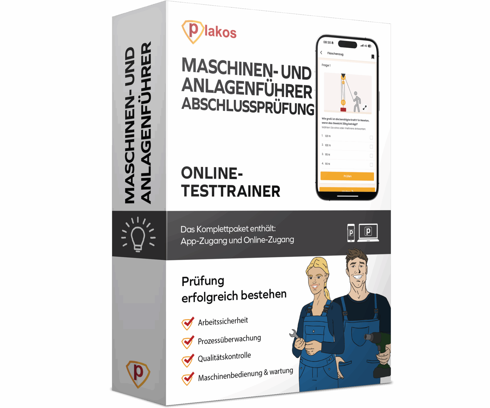 Die Abschlussprüfung zum Maschinen- und Anlagenführer ist der entscheidende Schritt, um deine Ausbildung erfolgreich zu beenden und in eine sichere Karriere in der Industrie zu starten. Du weißt, dass dich eine Fülle an Fachthemen erwartet: von der Steuerungstechnik und Wartung über Qualitätssicherung bis hin zu Wirtschafts- und Sozialkunde. Stehst du vor der Herausforderung, den gesamten Prüfungsstoff zu wiederholen, und fragst dich, welche Themen wirklich relevant sind? Mit unserem Plakos Online-Testtrainer bieten wir dir die perfekte, IHK-konforme Vorbereitung, damit du mit einem Top-Ergebnis abschneidest. Wir konzentrieren uns auf die Inhalte, die in den Abschlussprüfungen tatsächlich abgefragt wurden, und bieten dir prüfungsnahe Aufgaben, einen Fokus auf Kernprozesse wie Instandhaltung und eine realistische Prüfungssimulation. Zusätzlich steht dir der Plakos KI-Trainer 24/7 für schnelle Erklärungen zu komplexen technischen Begriffen zur Seite. Sichere dir jetzt deinen Abschluss und starte deine Fachkarriere durch!