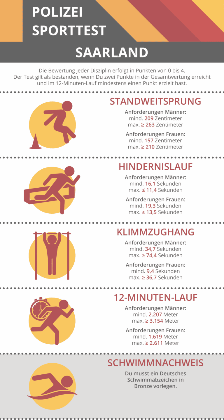 Für den Beruf des Polizisten ist die körperliche Fitness ein wichtiger Faktor. Im sportlichen Eignungstest hast Du die Chance, deine körperliche Leistungsfähigkeit in vier Disziplinen unter Beweis zu stellen: