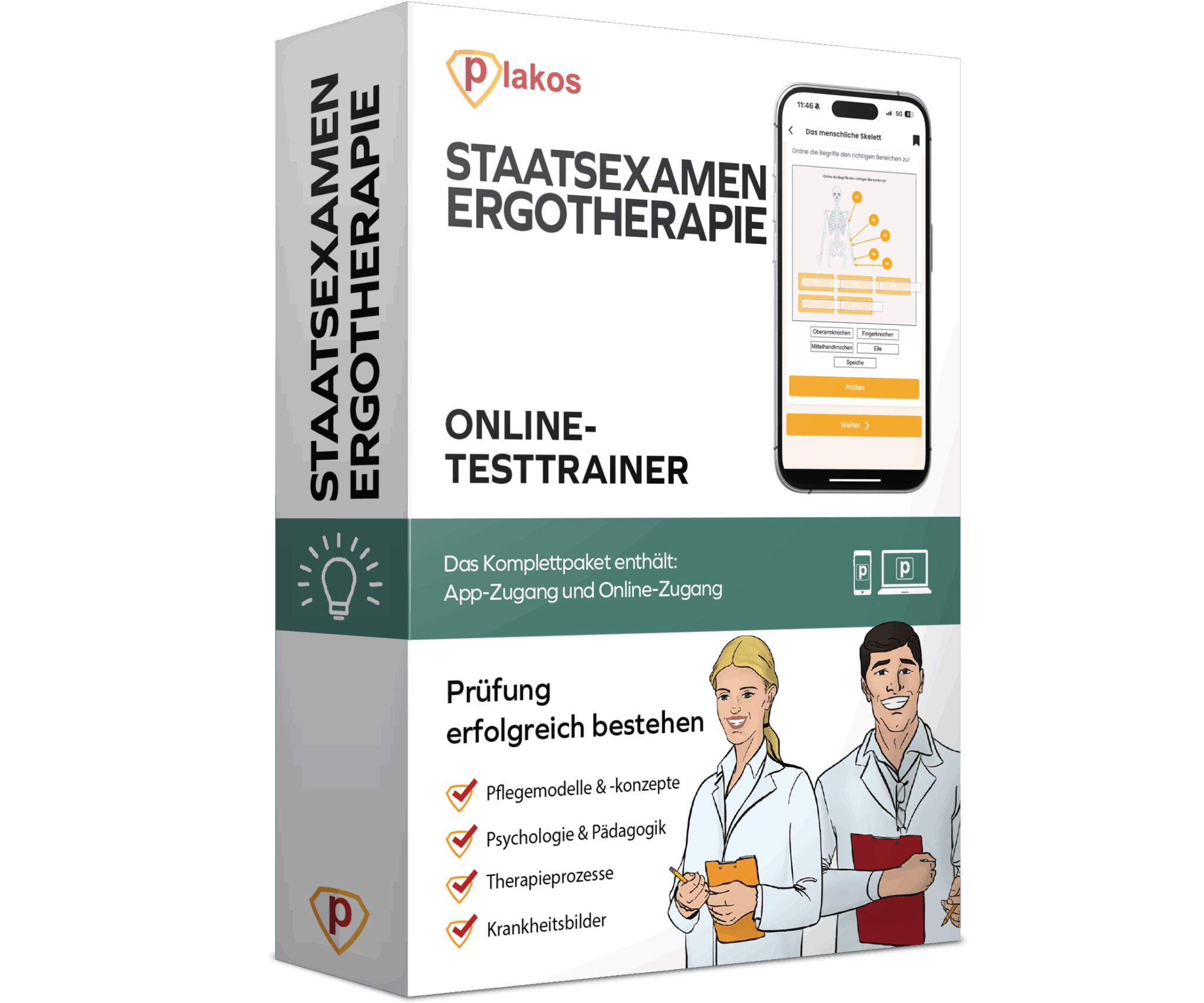 Eine große Auswahl an Übungsfragen, Lerntexten, Videos und Prüfungssimulationen findest du im Plakos Online-Trainer für Ergotherapie.