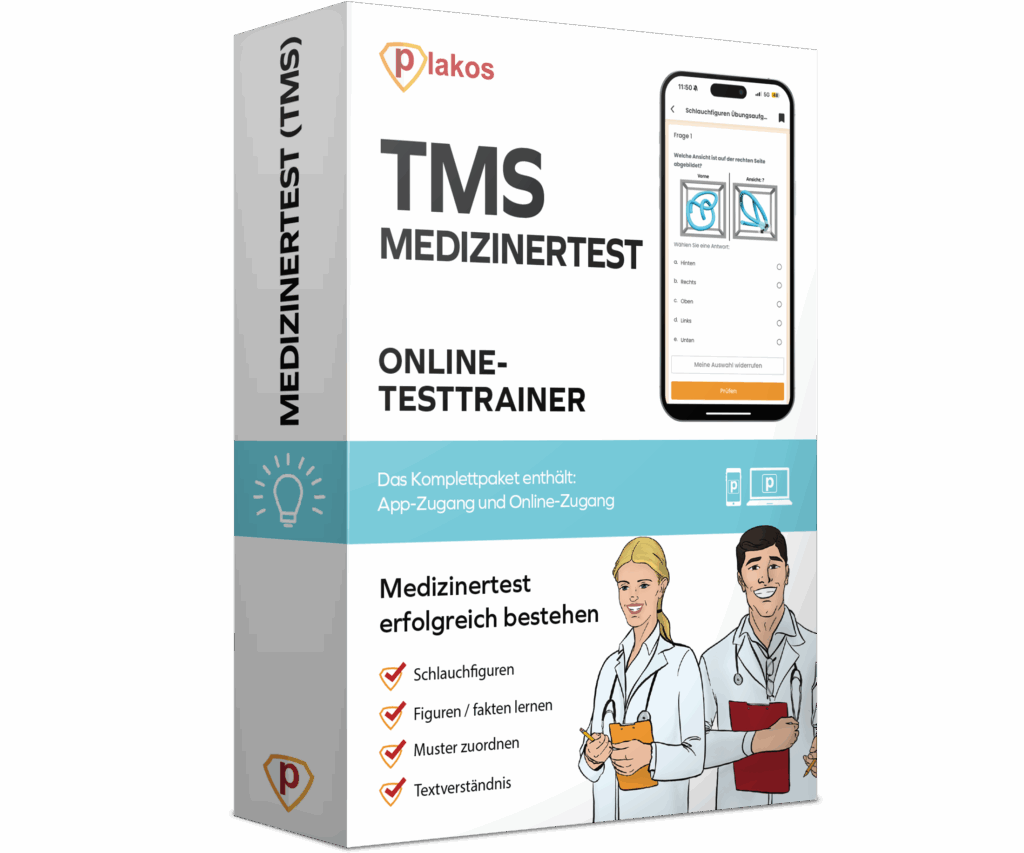 Ein Testtrainer, der dir zahlreiche Übungsaufgaben inkl. Lösungshinweisen zu den verschiedenen Aufgabentypen gibt, ist der TMS Online Testtrainer von Plakos. Mit diesem Testtrainer erhältst du zusätzlich Zugriff auf die passende Lern-App.