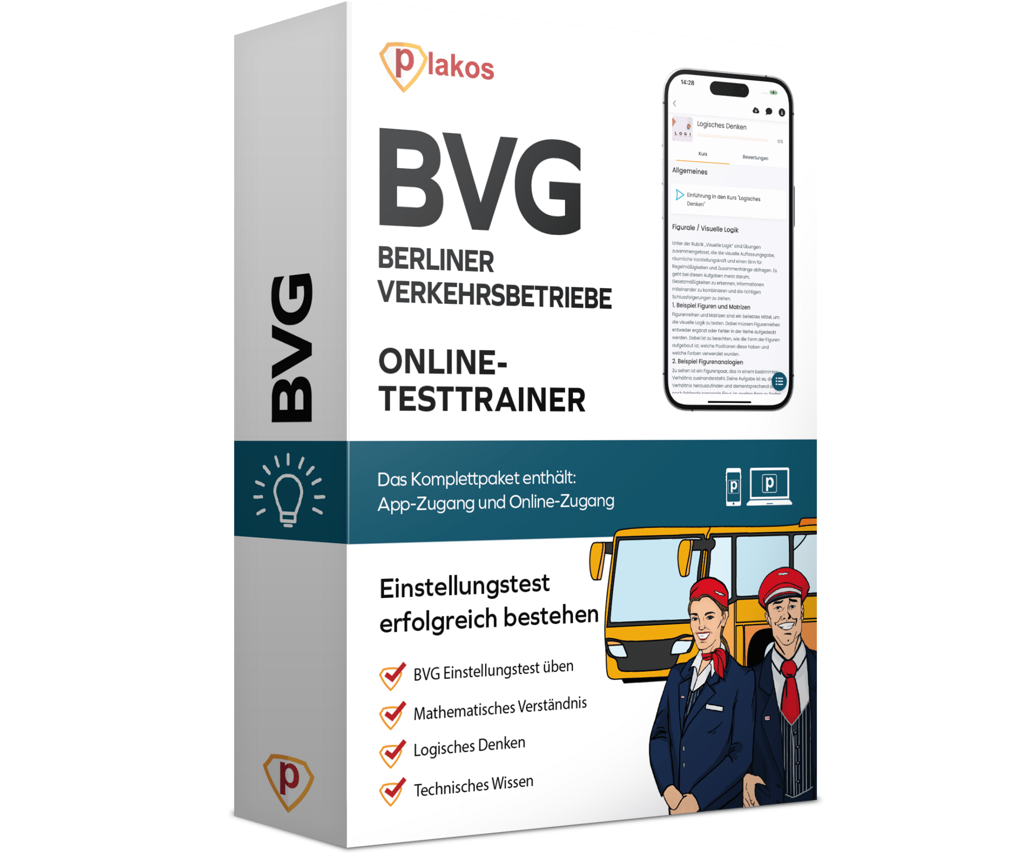 Bereite dich jetzt mit den Prüfungsfragen von Plakos optimal auf deinen BVG Einstellungstest vor, bequem mit deinem Smartphone oder Laptop! Trainiere mit zahlreichen interaktiven Übungsaufgaben und besiege deine Nervosität.