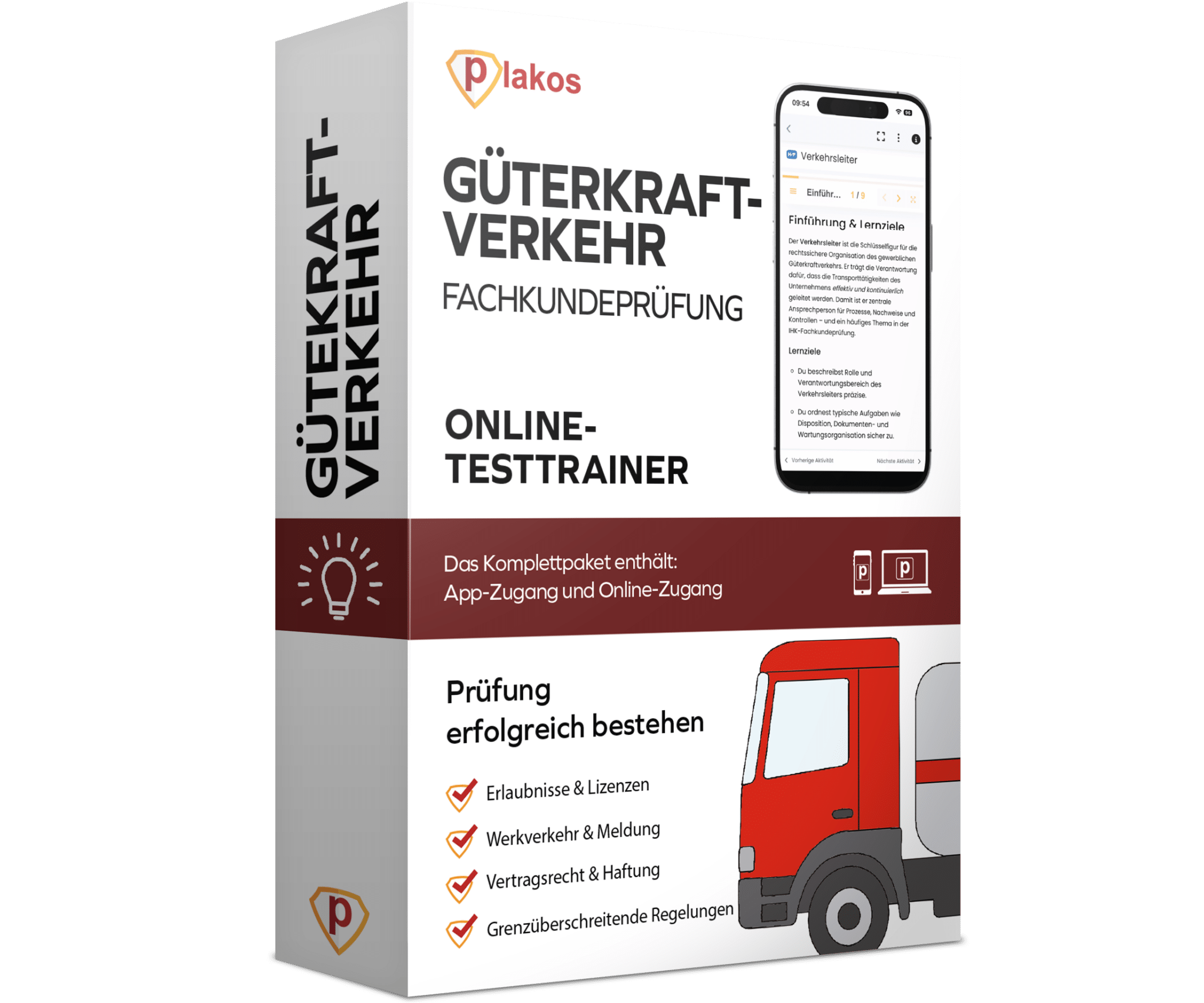 Bereite dich jetzt mit den Prüfungsfragen von Plakos optimal auf deine Fachkundeprüfung Güterkraftverkehr vor, bequem mit deinem Smartphone oder Laptop! Trainiere mit zahlreichen interaktiven Übungsaufgaben und besiege deine Nervosität.